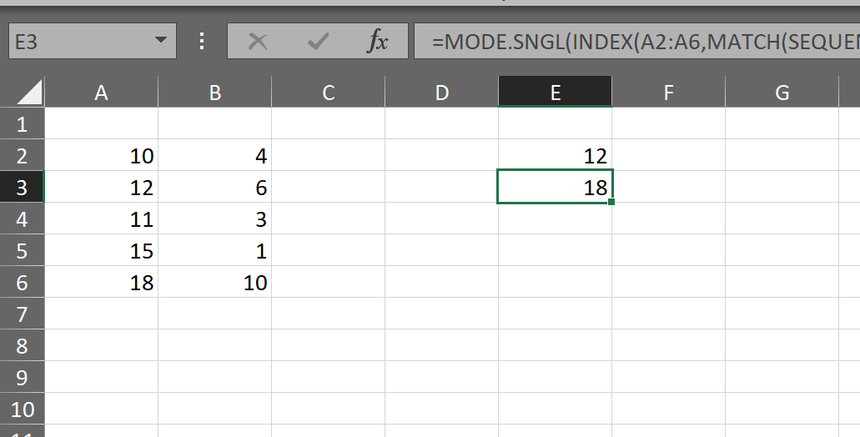 =MODE.SNGL(INDEX(A2:A6,MATCH(ROW($ZZ1:INDEX($ZZ:$ZZ,SUM(B2:B6)))-1,SUMIF(OFFSET(B1,0,,ROW(B2:B6)-MIN(ROW(B2:B6))+1,),"<>"))))