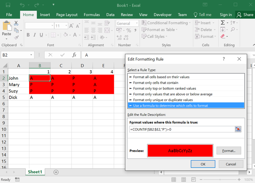 EDIT: the hidden column content is =COUNTIF(C5:F5,"P") for Dick, similarly for other rows.