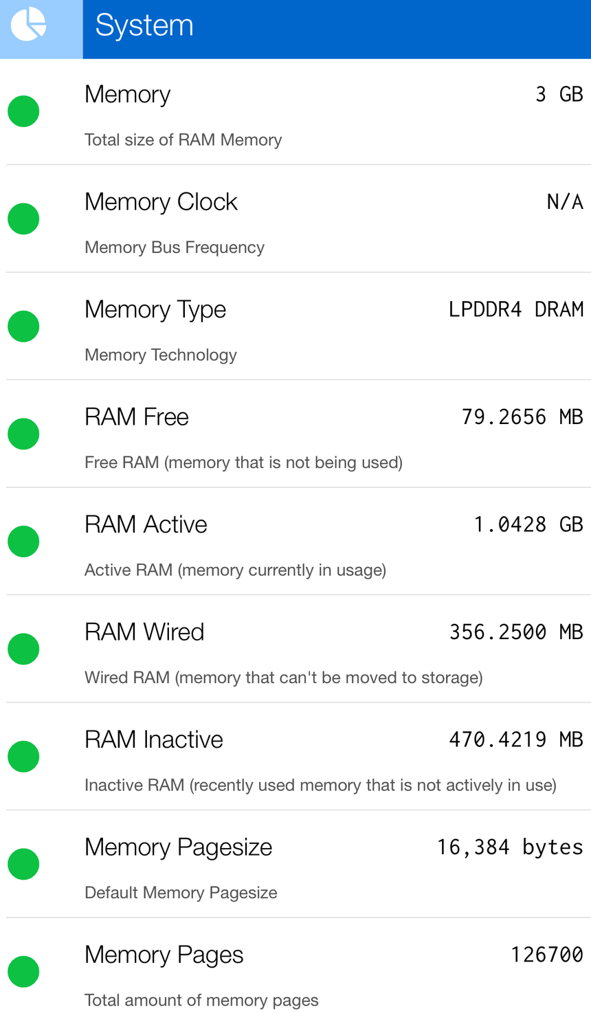 From the top-left menu, open This Device → System for details about your device’s RAM. For instance an iPhone 7+ has 3 GB of RAM: