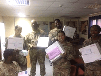 I was able to do it online, once you put his APO and go to check out it should adjust the shipping price. The large flat rate box should be around $20.. I wasn’t too specific on the customs form (snacks, letter, socks) and everything got there in two weeks!