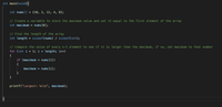 So I made a function to determine the maximum element of an array of integers. But when I try to print the value of the maximum element, it gives me a weird large number 1619117764., and isn't what I'm expecting. What am I doing wrong? Thank you so much in advance.