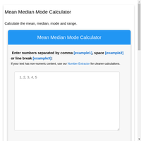 Step 1: Go to Cuemath's online mean median mode calculator. Step 2: Enter the numbers, within brackets, separated by commas in the given input box. Step 2: Click on the "Calculate" button to find the mean, median, and mode for the given numbers.