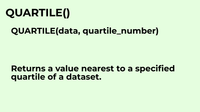 Returns a value nearest to a specified quartile of a dataset. Sample Usage QUARTILE(A2:A100,3) QUARTILE(A2:A100,B2) Syntax QUARTILE(data, quartile_number) data - The array or ra