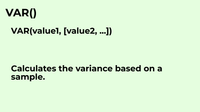 To calculate variance while interpreting text values as 0, use VARPA. VARP calculates variance for an entire population. To calculate variance across a sample, use VAR. VARP takes the sum of the squares of each value's deviation from the mean and divides by the number of such values.