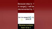 We will learn to write a python program to print numbers from 1 to 10 in reverse order using for loop. This small video in #viralshorts form is developed by ...