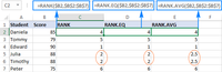 In the following example, RANK(A2,A1:A5,1) equals 3. The correction factor is (5 + 1 – 2 – 3)/2 = 0.5 and the revised rank that takes ties into account is 3 + 0.5 = 3.5. If number occurs only once in ref, the correction factor will be 0, since RANK would not have to be adjusted for a tie. Copy the example data in the following table, and paste it in cell A1 of a new Excel worksheet.