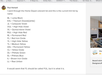 I know that Behr color codes were ... can was YL. I have the following: AXL=Permanent Yellow BL=Black CL=Yellow Oxide DL=Phthalo Green EL=Phthalo Blue FL=Red Iron Oxide IL=Brown Iron Oxid......