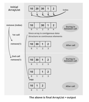 removeAllapproach the disadvantage is that we have to iterate twice. First we iterate in the foor-loop looking for an object that matches our removal criteria, and once we have found it, we ask to remove it from the original collection, which would imply a second iteration work to look for this item in order to remove it. - I think it is worth mentioning that the remove method of the