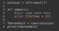 July 25, 2021 - This returns none. Ideal behind program is to convert Celsius to Fahrenheit using Fahrenheit = (9/5) * celsius + 32 But when I write return (9/5) * c + 32 it gives the desired result Just curious on the difference between print ((9/5) * c + 32) and return