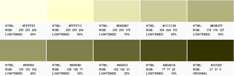 Well the colour Olive Green from an off-shoot of the page you've linked to can be represented in hexadecimal as #333300. Using an online tool like this one we can easily make it lighter or darker by a certain percentage. In this case, making it 60% Lighter results in the colour #CCCC99.