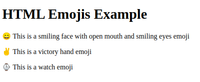 HTML emojis can be inserted into HTML documents. Emoji are small graphical images that are used to represent emotions, objects, and ideas. They can be inserted into HTML documents by using character code. For example, π Browser Output Here, π is the character code for the above emoji.