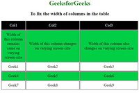 You can set the width of a table column using the CSS width property of the col element. The width value is most commonly specified in pixels (width: 200px;), or as a percentage of the width of the parent element (width: 50%;). Example with inline style attribute: