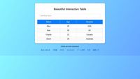 <!DOCTYPE html> <html lang="en"> <head> <meta charset="UTF-8"> <meta name="viewport" content="width=device-width, initial-scale=1.0"> <title>Interactive Table</title> <link rel="stylesheet" href="styles.css"> </head> <body> <div class="container"> <h2>Beautiful Interactive Table</h2> <input type="text" id="searchInput" placeholder="Search by name..." onkeyup="searchTable()"> <table id="sortableTable"> <thead> <tr> <th onclick="sortTable(0)">Name</th> <th onclick="sortTable(1)">Age</th> <th onclick="sortTable(2)">Country</th> </tr> </thead> <tbody> <tr><td>Alice</td><td>25</td><td>USA</td></tr>