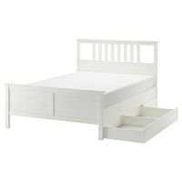 HEMNES Bed frame with 4 storage boxes - white stain King. Practical storage for an extra pillow, duvet or bedspread. Made of solid wood, which is a durable and warm natural material. Adjustable bed sides allow you to use mattresses of different thicknesses.