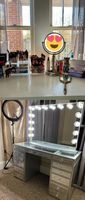 Top photo: old setup, ikea desk with all makeup displayed. Bottom photo: I won a giveaway from Impressions Vanity on Instagram for a free Mirrored Vanity and huge lighted mirror. Can’t WAIT to organize this new space!
