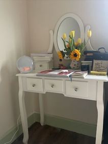 If you dream of the perfect vanity table, it probably has mirrors all around with great lighting, a separate hair station and lots of handy drawers and shelves for your make-up and accessories.