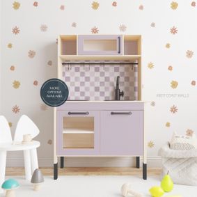Petit Abode IKEA Play Kitchen Decor and Accessories. DIY IKEA wooden cooktop and wooden pretend play sets. Wooden toys Splashback Wallpaper Peel and Stick Reusable Kids Baby Children Childrens Free Ikea Ikea hack Kmart Kmart hack Kmart cubby Kids space Playroom Play Toddler DIY DIY Kmart DIY IKEA DIY Target Wooden Cook