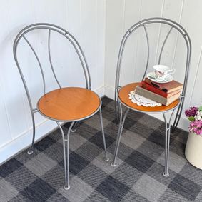 Details Brand: IKEA Model: Agne Era: 1990s Material: Metal frame, solid pine wood seat Color: Black frame, brown pine seat Features: Stackable, sturdy, slightly flexible backrest Dimensions: Height: 80 cm Width: 52 cm Depth: 47 cm Seat height: 45 cm Condition: Good vintage condition with normal signs of use. Some stains, chipped areas, and scratches consistent with age. Why You’ll Love It ✔ Authentic vintage IKEA collectible from the 1990s ✔ Industrial-meets-Scandinavian design – minimalist yet functional ✔ Stackable and space-saving – perfect for small apartments or dining areas ✔ Sturdy metal frame with a warm wooden seat ⚠ Note: Due to weight, these are being sold in sets of two.