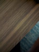 I used a circular saw with a track, and I gave the cut the same angle it already had on the rest of the table. I was concerned the inside was going to be particle board or even hollow, but it is some kind of MDF. I finished the ends with Walnut Danish Oil (Watco).