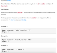In any case, let's see a simple implementation of the above logic. var strStr = function (haystack, needle) { if (needle.length === 0) return 0; if (needle === haystack) return 0; for (let i = 0; i <= haystack.length - needle.length; i++) { ...
