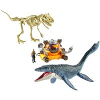 Get ready for thrilling action and adventure with Jurassic World! The Jurassic World Quest for Indominus Rex Packis perfect for storytelling fun and to recreate a key scene from Jurassic World: Fallen Kingdom! Get the underwater action-adventuregoing with the Real Feel Skin Mosasaurus figure, Indominus Skeleton and a fully submersible Matchbox Submarine vehicle and submarine pilot action figure. Use these exciting figures and submarine vehicle to set up and play out the exciting action-adventure scene from Jurassic World! Colors and decorations may vary.