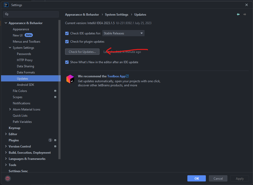 File | Settings | Appearance & Behavior | System Settings | Updates