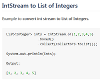 In this tutorial, We'll learn about the new java 8 IntStream API boxed() method. IntStream boxed() returns a Stream consisting of the elements of this stream, each boxed to an Integer. That means to convert all primitive int values to wrapper Integer type objects Stream.