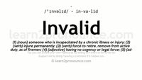 Word forms: plural invalids pronunciation note: The noun is pronounced (ɪnvəlɪd ). The adjective is pronounced (ɪnvælɪd ) and is hyphenated in|val|id.