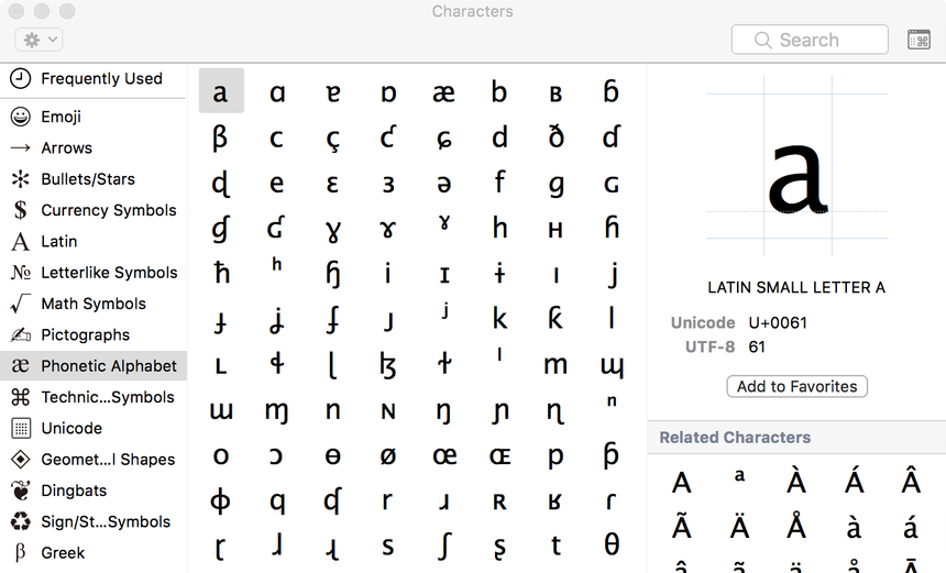 Alternatively, if you don't need quite the level of speed that can offer, you can simply use the Character Palette (Edit > Emoji and Symbols) to type the characters by double-clicking them. To get the "Phonetic Alphabet" pane to show up, customize which are visible with the gear icon in the top left.