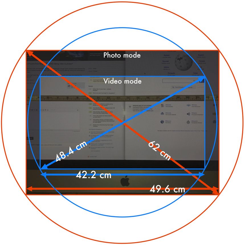 From these images, I estimate the width of the photo mode \$w_\mathrm{P} = 49.6\,\mathrm{cm},\$ and \$w_\mathrm{V} = 42.2\,\mathrm{cm}.\$