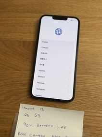 iPhone 13 128gb No cracks or scratches Senior used Includes everything in pictures (no charging cord) Battery life @ 89% If ad is up, phone is availableView more ... iPhone 13, 128GB, Pink, Unlocked for $480 iPhone 13, 128GB, Navy, Unlocked for $480 A Tempered Glass Screen Protector included.