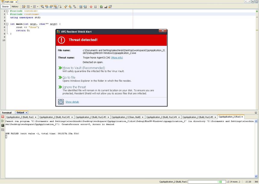 Step 3. An easy way to convince AVG that your C++ program is safe is to add the c++ statement: system("pause"); in the beginning of your C++ program and recompiling and re-running. For me, AVG then warns me about it, I click ignore, then it lets me run it anyway. Also, try using 'return 1' instead of 'return 0' at the end of your main function. It will let you run it. If that seems bizarre, it is. Virus writers are smarter than antivirus writers by getting antivirus software to see to many false positives.
