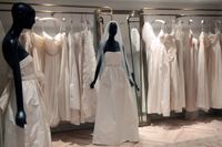 J.Crew Marbella Gown in Champagne (a warm cream color): 100% silk, lovely strapless sweetheart neckline, flattering pleated bodice, fully lined. $350.