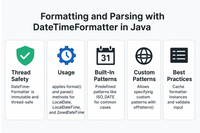 September 15, 2025 - 7. Does DateTimeFormatter support week-based years? Yes, using YYYY instead of yyyy. 8. What’s the performance impact of creating formatters repeatedly? Minimal, but reuse constants for efficiency. 9. How to format milliseconds and nanoseconds? Use SSS for milliseconds, nnnnnnnnn for nanoseconds. 10. Can I combine literals in patterns? Yes, enclose them in single quotes ('at'). Example: "yyyy-MM-dd 'at' HH:mm". This tutorial is part of our Java Date Time Api .