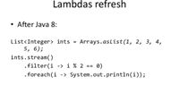 returnin a lambda equals acontinuein a for-each, but there is no equivalent to abreak. It's also difficult to do things like return values, short circuit, or set flags (which would have alleviated things a bit, if it wasn't a violation of the no non-final variables rule). "This is not just an optimization, but critical when you consider that some sequences (like reading the lines in a file) may have side-effects, or you may have an infinite sequence."Might execute in parallel, which is a horrible, horrible thing for all but the 0.1% of your code that needs to be optimized. Any parallel code has to be thought through (even if it doesn't use locks, volatiles, and other particularly nasty aspects of traditional multi-threaded execution). Any bug will be tough to find.
