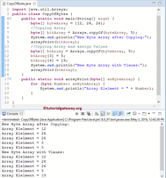 String[] original = {"Apple", "Banana", "Carrot", "Lemon", "Orange", "Grape"}; String[] copy1 = Arrays.copyOf(original, original.length); String[] copy2 = Arrays.copyOf(original, 3); String[] copy3 = Arrays.copyOf(original, 10); System.out.println("original array: " + Arrays.toString(original)); System.out.println("copy #1 (same length): " + Arrays.toString(copy1)); System.out.println("copy #2 (truncated): " + Arrays.toString(copy2)); System.out.println("copy #3 (padded): " + Arrays.toString(copy3));Output: original array: [Apple, Banana, Carrot, Lemon, Orange, Grape] copy #1 (same length): [Apple, Banana, Carrot, Lemon, Orange, Grape] copy #2 (truncated): [Apple, Banana, Carrot] copy #3 (padded): [Apple, Banana, Carrot, Lemon, Orange, Grape, null, null, null, null]Here, note that the padded elements are initialized to nulls (for object reference types).