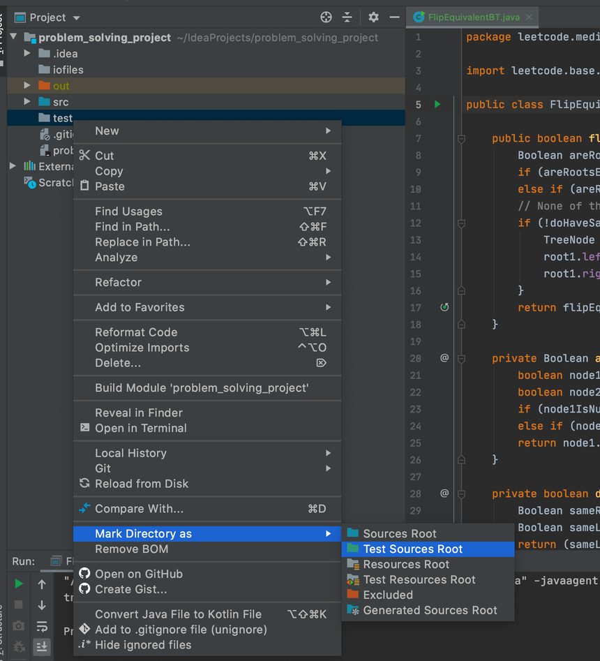 2- Right-click on the test folder and create the proper package. I suggest creating the same package names as the original class. Then, you right-click on the test directory -> mark directory as -> test sources root.