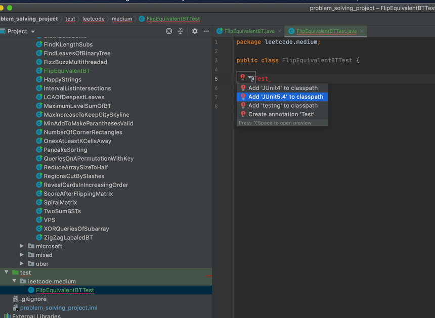 4- In the created class, type '@Test'. Then, among the options that IntelliJ gives you, select Add 'JUnitx' to classpath.
