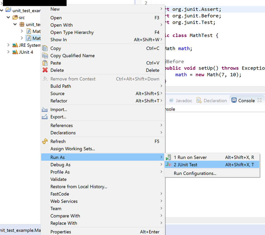 9- Right-click on your test class in package explorer and click on Run as -> JUnit Test.