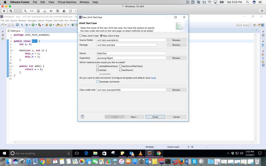 6- Check setUp() and click on finish. The method setUp() will be the place where you initialize your test.
