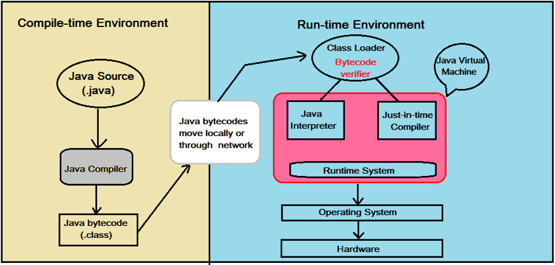 - Then, as shown in the right section of the above image, another program called java starts the Java runtime environment and it may compile and/or interpret the bytecode by using the Java Interpreter/JIT Compiler.