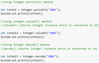 January 10, 2023 - In the following Java program, we are parsing the string “1001” using all three above-mentioned methods and verifying that output. Assertions.assertEquals(1001, Integer.parseInt("1001")); Assertions.assertEquals(513, Integer.parseInt("1001", 8)); Assertions.assertEquals(1001, Integer.parseInt("amount=1001", 7, 11, 10)); All three methods throw NumberFormatException if: the argument string is null. the argument string length is zero i.e. empty string.