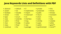 Java Language Reserved Words/Keywords: abstract · continue · for · new · switch · assert · default · goto · package · synchronized · boolean · do · if · private · this · break · double · implements · protected · throw · byte · else · import · public ·