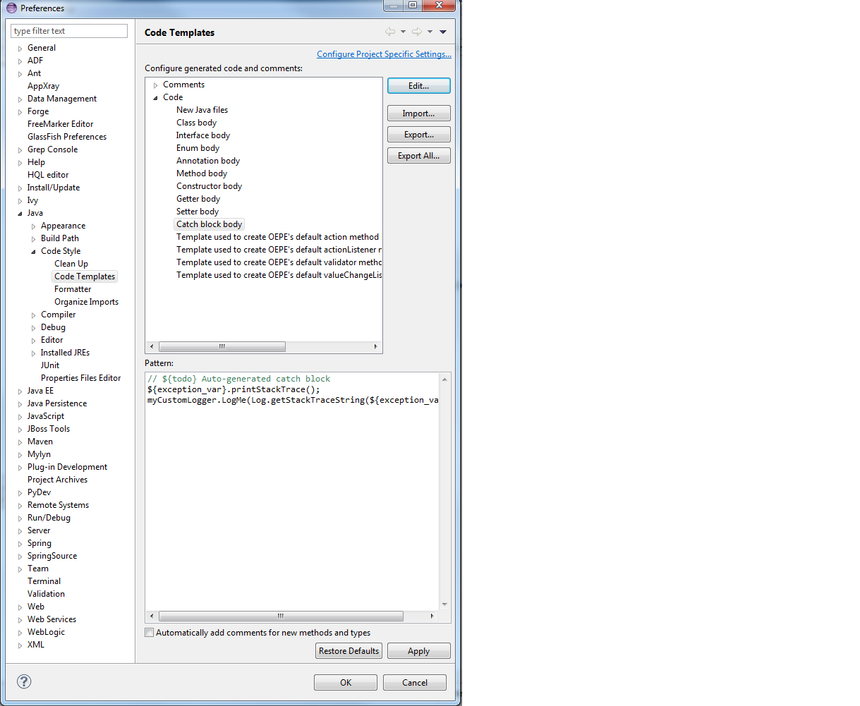 - In Preferences, navigate to Java>Code Style>Code Templates.