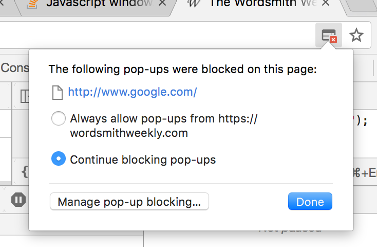 When Chrome detects a call to window.open() which does not originate from a user gesture, it blocks it as a pop-up.