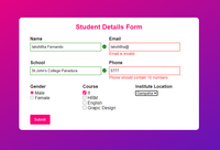 January 28, 2024 - var nameError = document.getElementById('nameError'); var emailError = document.getElementById('emailError'); var schoolError = document.getElementById('schoolError'); var phoneError = document.getElementById('phoneError'); var checkBoxError = document.getElementById('checkBoxError'); var radioError = document.getElementById('radioError'); //validate name function validateName(){ let name = document.getElementById('name'); if(name.value.length == 0){ nameError.innerHTML = 'Name is required'; name.style.border = "1px solid red"; return false; } if(!name.value.match(/^[a-zA-Z ]+$/ )){ nameError.