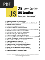The document contains 25 JavaScript quiz questions testing knowledge of JavaScript concepts like data types, operators, functions, objects, and more. It includes the question, possible answers, and the correct answer explanation.