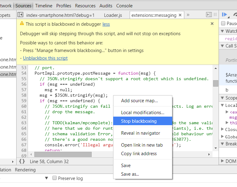 ...How can I step through my javascript code line by line using Google Chromes developer tools without it going into javascript libraries?...