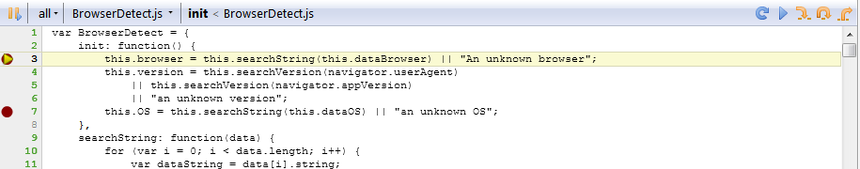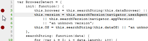 You can now add breakpoints by clicking the line to the left of the piece of JavaScript code you want to add the breakpoint to: