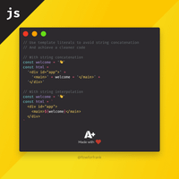 return `<h1>Hello '${ firstName }', welcome to your account.</h1>`;Ok, so you're typing 1 less char, is that the only benefit? Are there performance benefits? It's certainly not significantly more legible or anything. What's the use case where template literals are just far and away superior to plain old string concat?